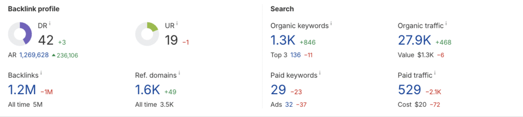 New referring domains, Domain Rating (DR) improved from 39 to 42